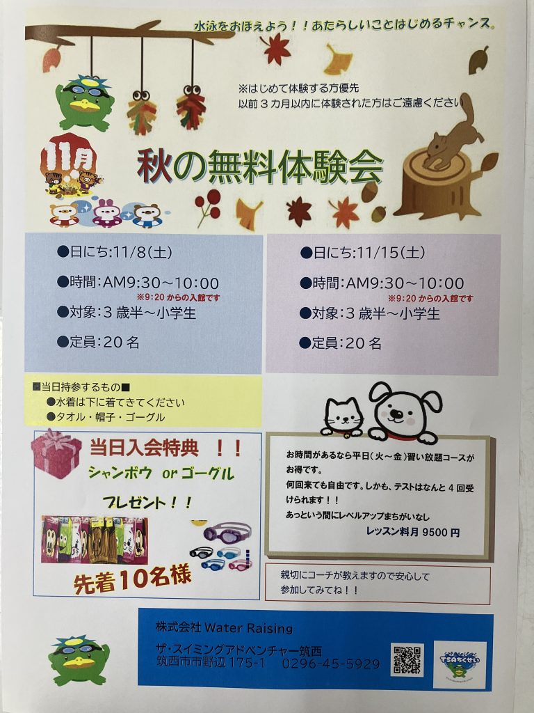11月8日、15日(両日とも土曜日)に無料体験会を開催いたします。